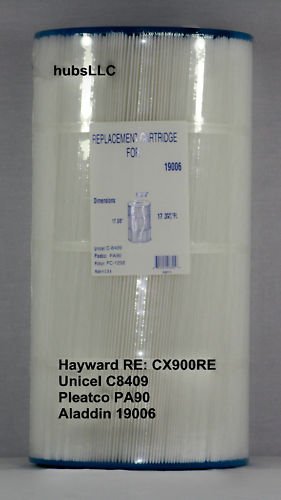 Product DescriptionThe cartridges are made in the USA by Aladdin, a company in business for 60 years, who makes cartridges for major pool retailers under their private label names.We buy directly from the manufacturer .... no middle man.The filter cores are made from extruded PVC pipe. The custom core configuration is designed for optimum water flow and efficient filtration. This core doesn't require a flow restricting adapter support in the center and is the strongest in the industry. The end cap is made from high quality polyurethane to provide strength and chemical resistance, with an anti fungal Biocide added. The filter media is of the highest quality Freudenberg hydrotexx filtration media designed for the perfect balance of clarity, cleaning ability, and long life.Replacement Cartridge fits:Hayward CX900,Star-Clear Plus C900,Unicel C-8409,Pleatco PA90,Aladdin 19006,Aladdin 19002Filbur FC-1292PLEASE CHECK YOUR MEASUREMENTS FOR A MATCH